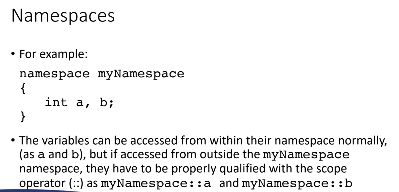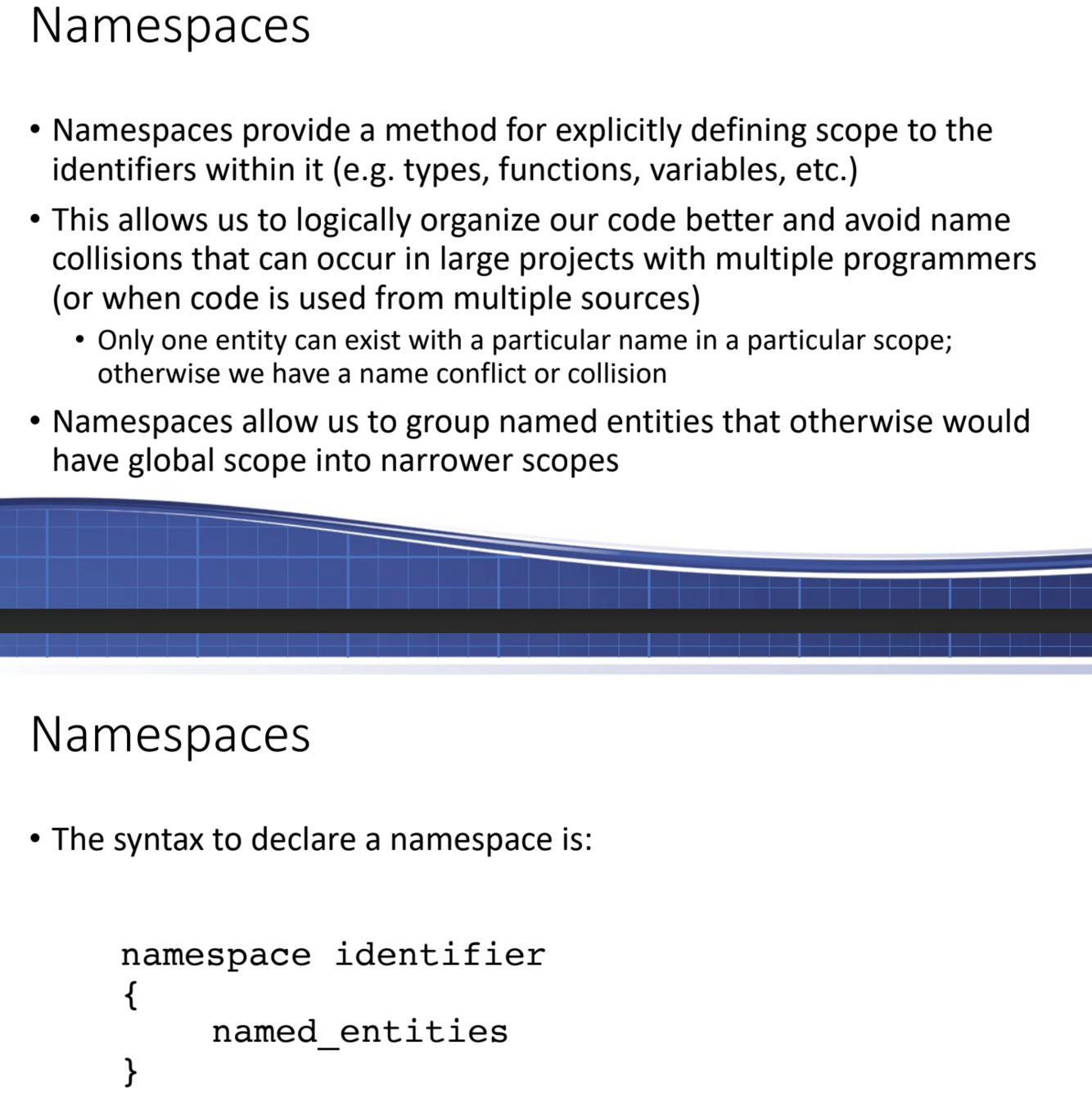 What are namespaces? What is the syntax for declaring a namespace?