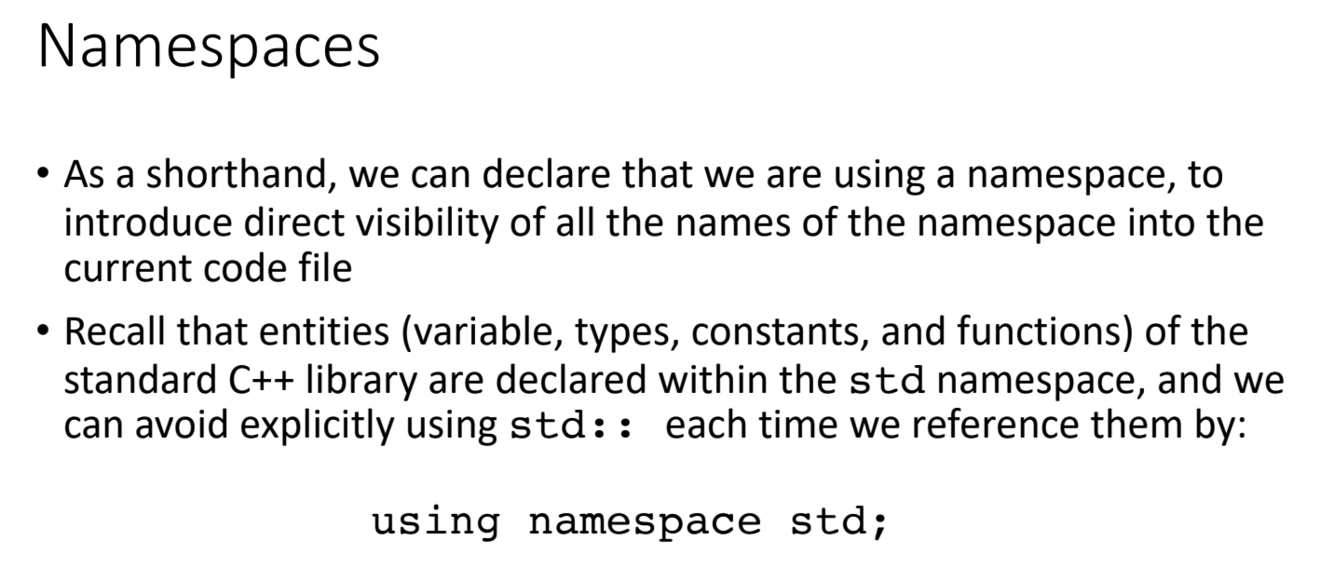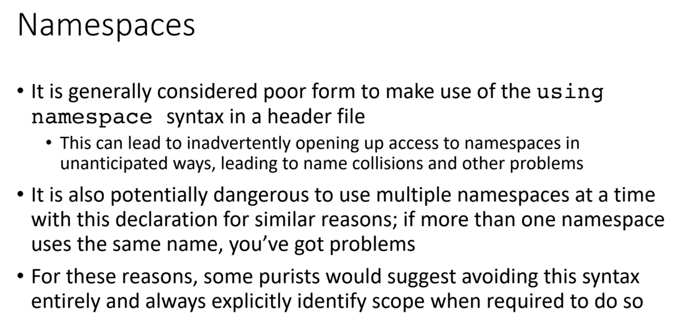 Should you include the ‘using namespace …’ syntax in a header file? Why?
