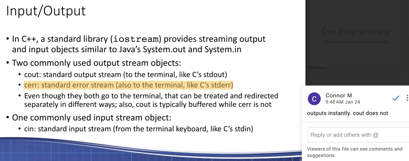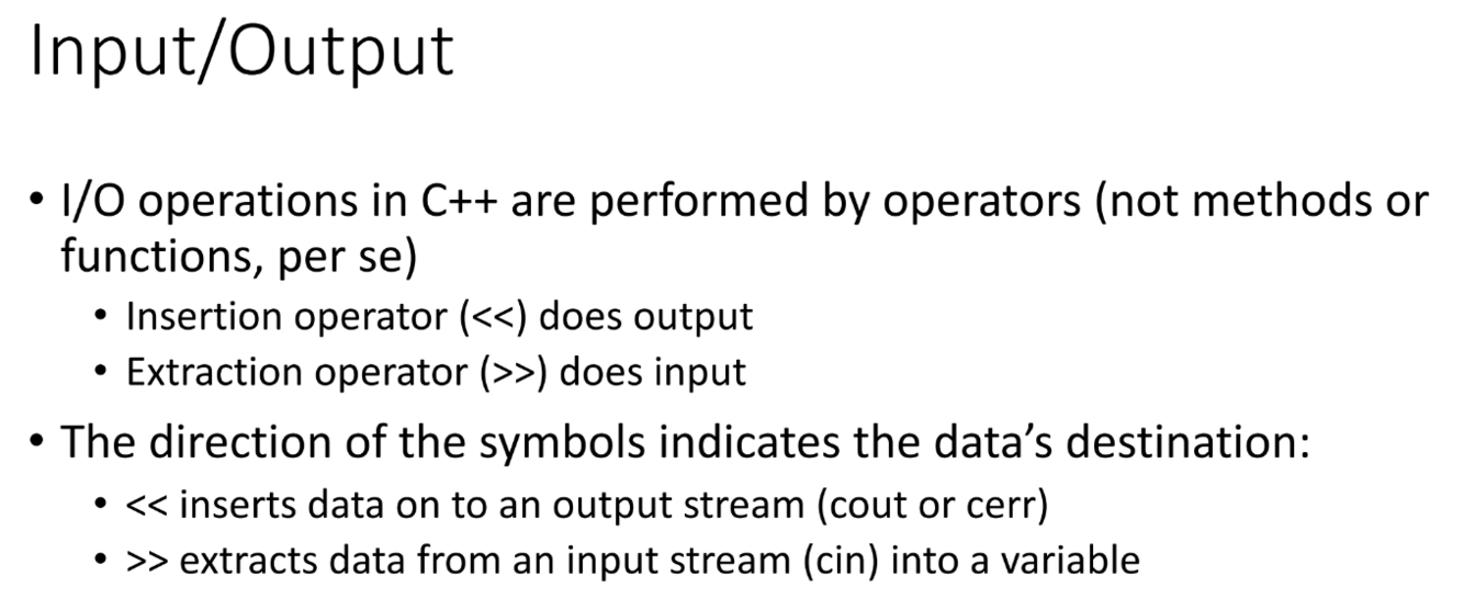 What is the standard library for input and output in C++? What are two commonly used output stream objects in C++? Common input stream?