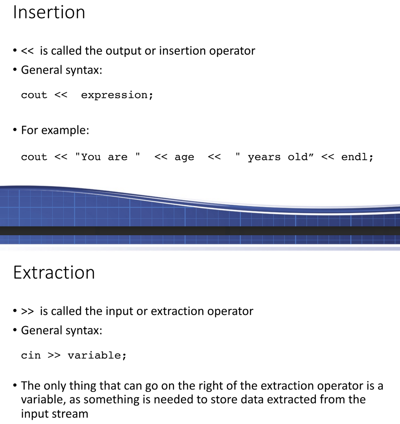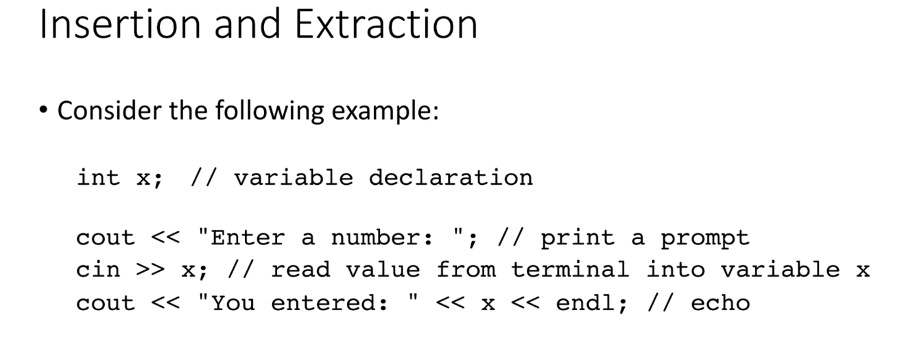 What are the insertion / extraction operators? What is the only thing you can put on the right of the extraction symbol?