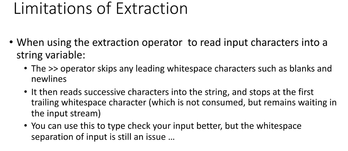 When using the extraction operator to read input characters into a string variable, how are leading whitespace characters treated?