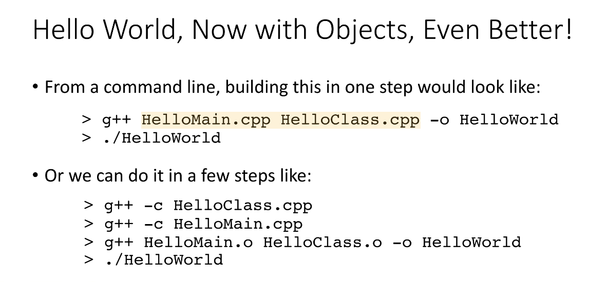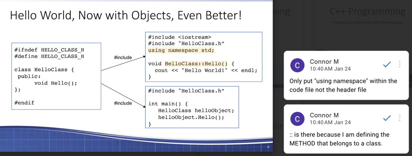 What is the general format of having a main C++ file, a C++ class file, and a C++ header? Where would you put the ‘using namespace’ line?