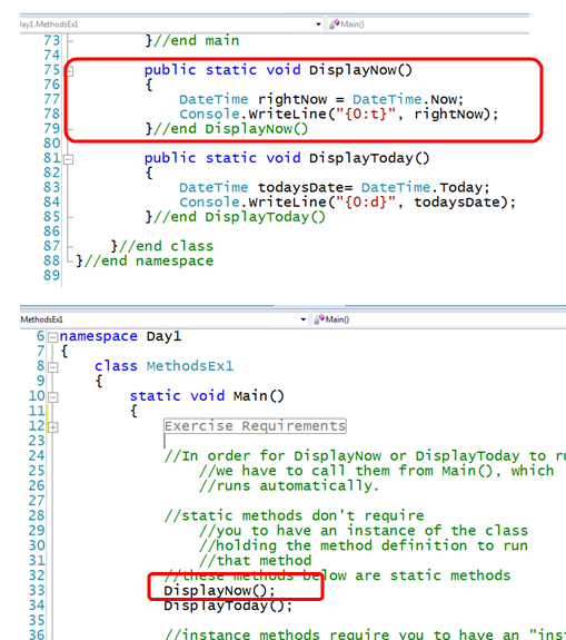 Examples: Console.WriteLine(), Main(), or DisplayNow() below (note void in declaration, and no instance of MethodsEx1 class needed to call it from Main().