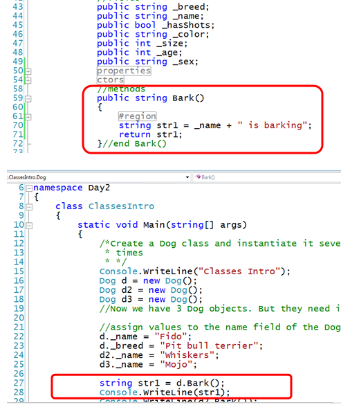 The default access modifier for a method, an instance method requires you to have an instance of the class it’s created inside in order to call it. You won’t declare a method as an instance method unless you plan to make objects from the class in which you’re declaring the method. Example: Note the source code file (ClassesIntro.cs) contains a new class for Dog, and Dog has its own methods. If you want individual Dog objects to be able to perform that method, you’ll need to make them instance methods. You can leave off the word “instance” in your Bark() method because the default access modifier defaults to instance. You’ll need a Dog object before you can call it from Main():