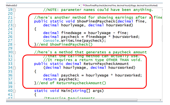 Specified when declaring a method. Designates what data, if any, should be “returned” as a result of running the method. A method that just runs a Console.WriteLine() method that displays a result of calculations is not “returned data”. If no “data will be returned”, the return type is “void”. If your return type is not void, it should specify a data type of the data you will return(string, int, bool, Random, DateTime, etc). ALSO, you will need a return statement at the end that lets you choose what actual data to return (its data type must match the return type you specified). Examples below show a method declared with a void data type (ShowFinedPaycheck()) and one that returns a decimal (ReturnPaycheckAmount());