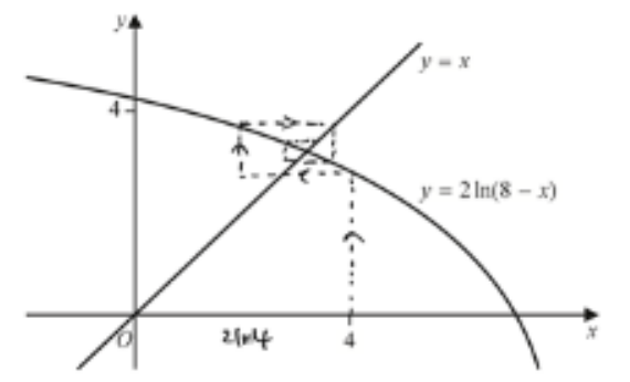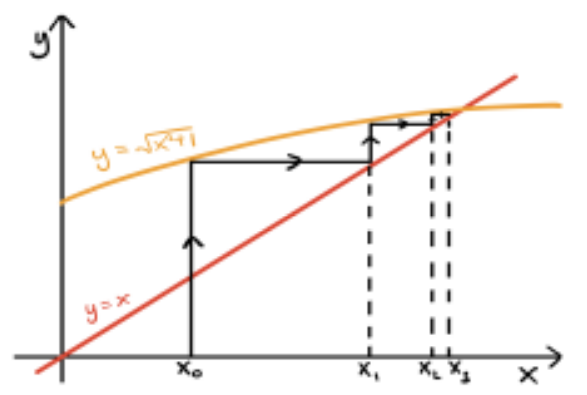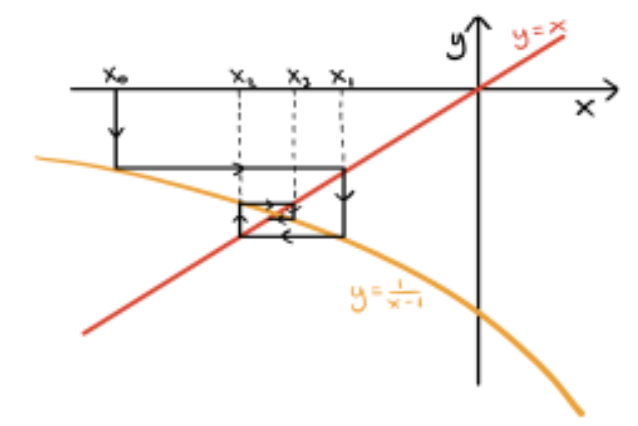 draw line vertically to curve, then horizonatally to y = x, then vertically to curve, then horizontally to y = x …