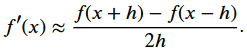 the difference between the function’s (y) values at points (x+h) and (x-h), divided by the distance (2h) between them: