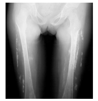 Extensive soft-tissue calcifications are noted bilaterally in