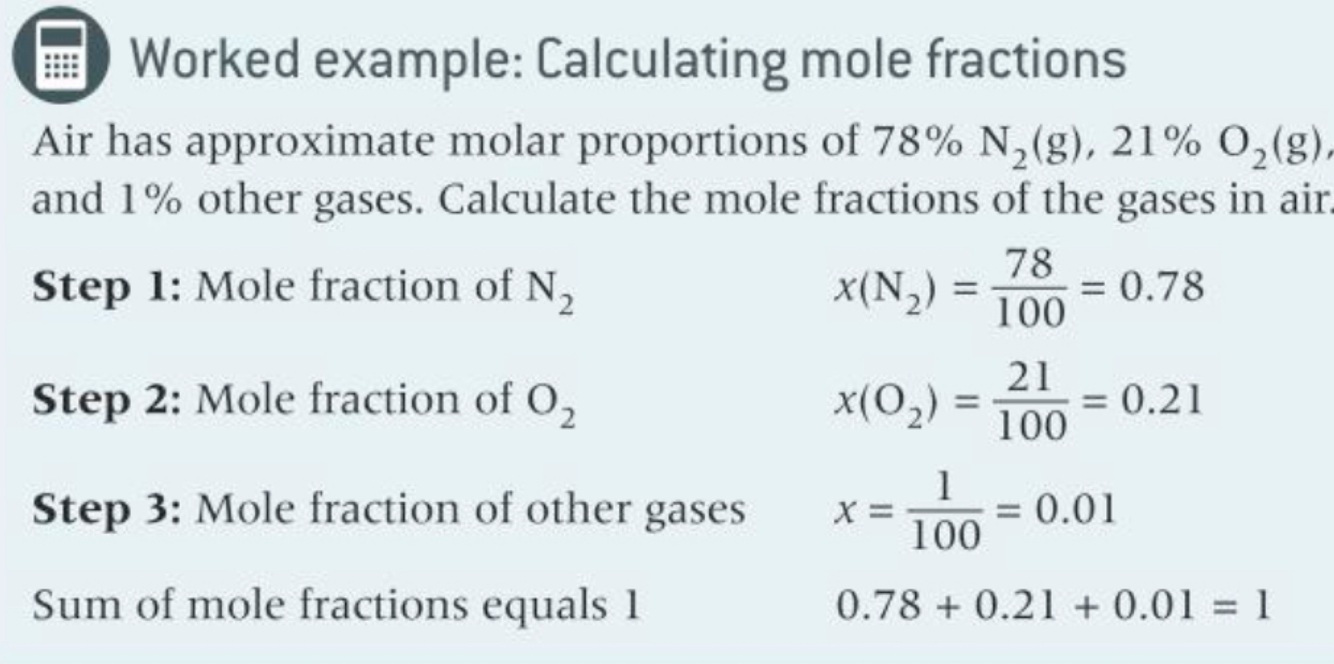 Mole fraction x(A) = number of moles of A / total numbers of moles in a gas mixture