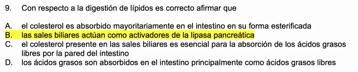 b. correcta, los ácidos grasos libres no se absorben, sino se degradan se van por las heces