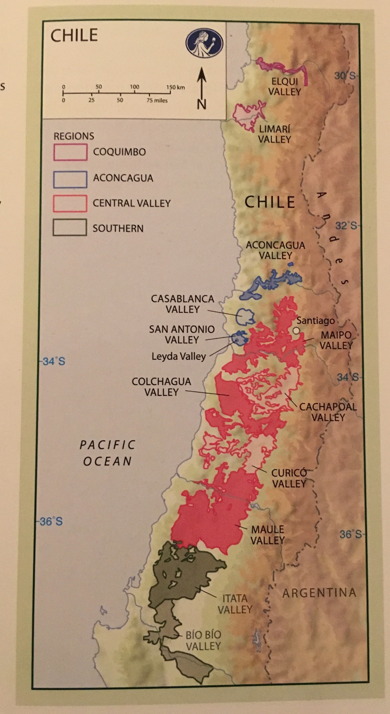 By four broad areas: The Pacific Ocean to the west The coastal mountain ranges just inland The Andes to the east A large depression south of Santiago where the two mountain ranges separate, known as Central Valley