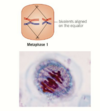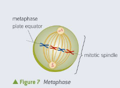 1) Chromosomes moved by spindle fibres to form a plane in the centre of the cell (metaphase plate)