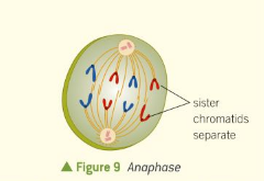 2) Chromatids separated and pulled to opposite poles by shortening spindle fibres