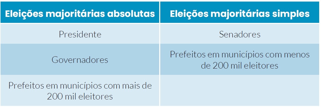 * Absoluto - Eleições para presidente, governadores e prefeitos (esta, em cidades que tenham mais de 200 mil habitantes);
