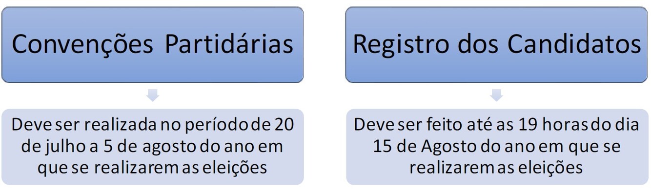 4. Estabelece a Lei das Eleições que os partidos devem realizar as convenções de escolha de candidatos de 20 de julho a 5 de agosto do ano das eleições.