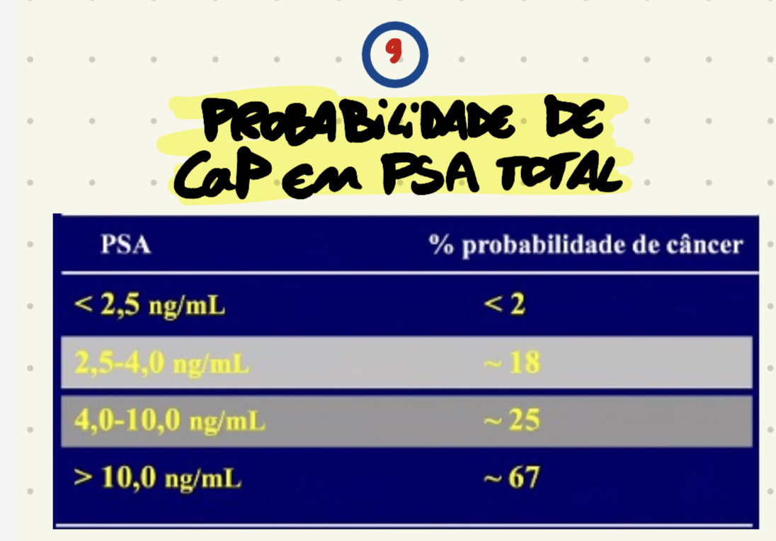 PSA > 10ng/ml = 67% - avaliar densidade de PSA, velocidade de PSA e PSA livre