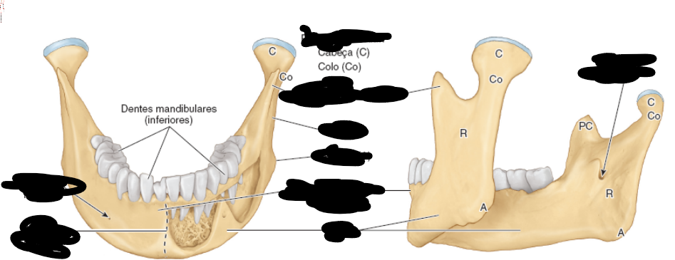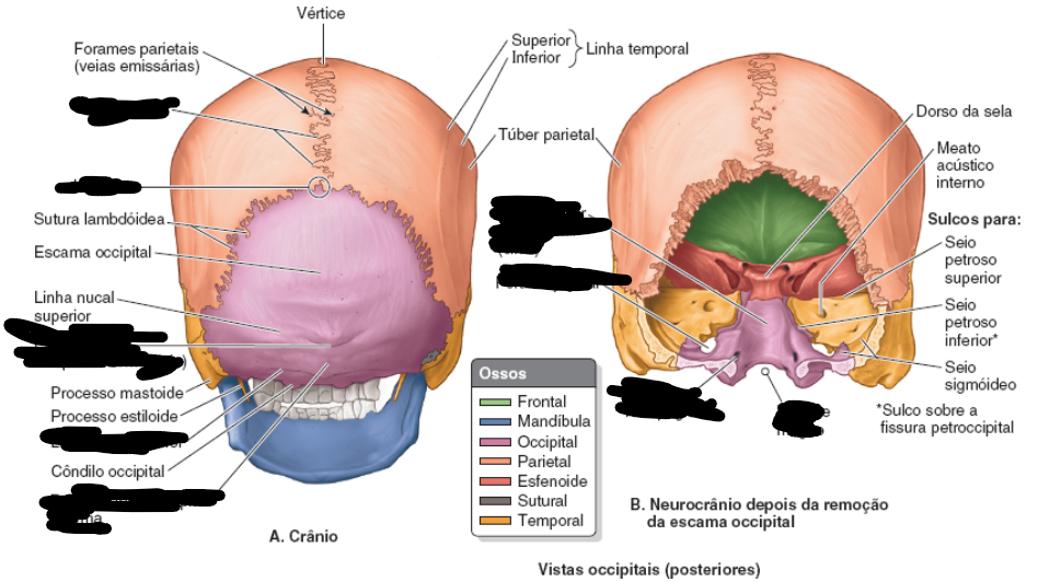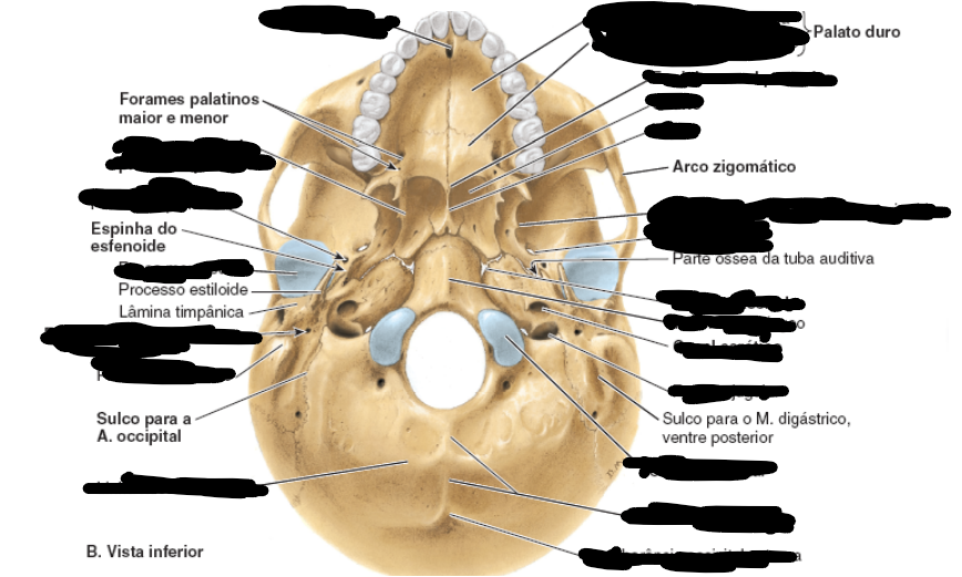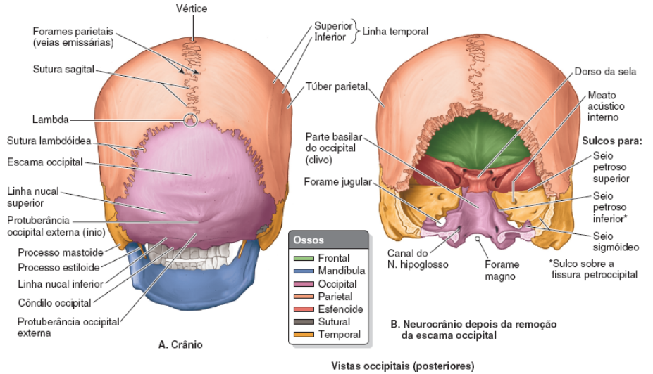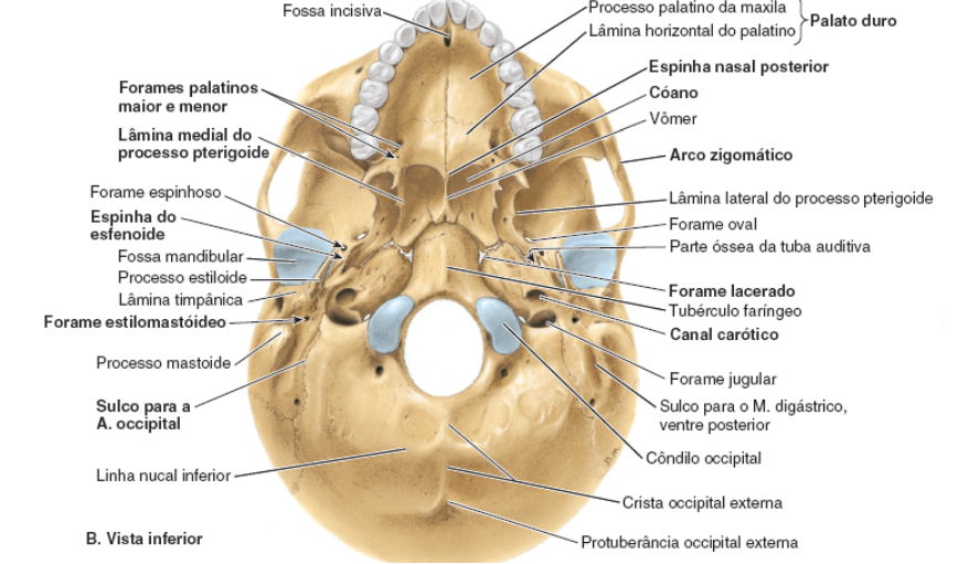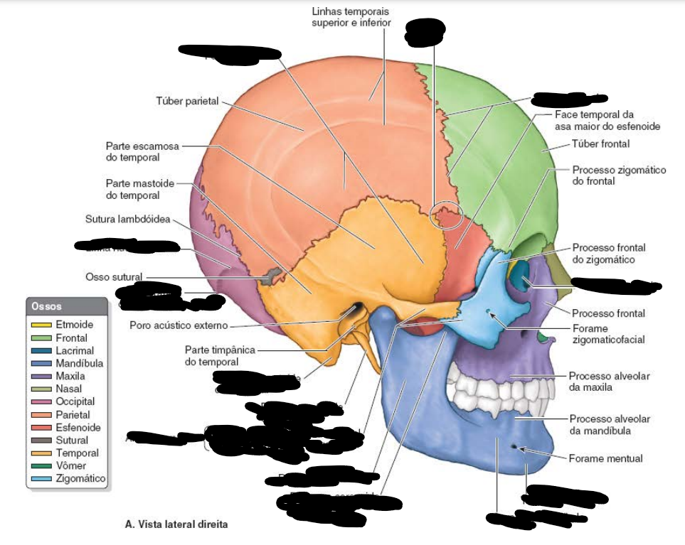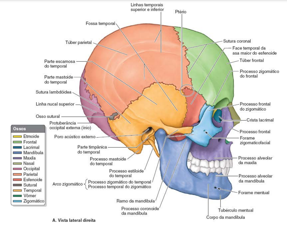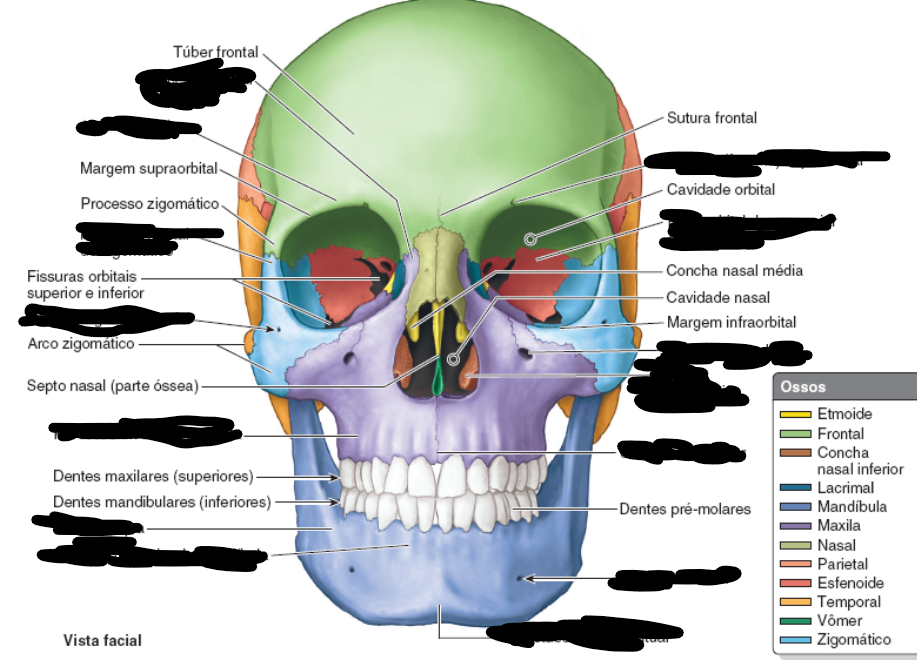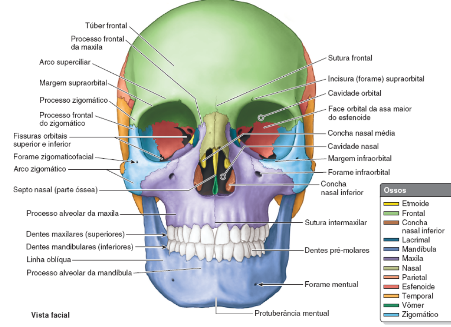 Osso frontal, parietais, temporais, occipital, esfenoide, etmoide, maxilas, zigomáticos e mandíbula