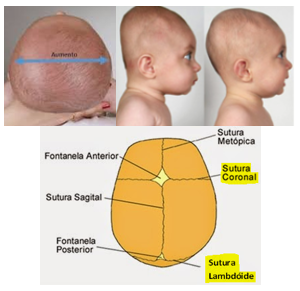 Craniossinostose das sutura coronal e/ou lambdoide bilaterais → ↑ diâmetro transverso