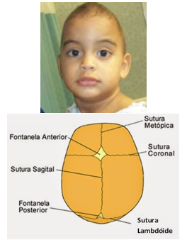 Craniossinostose da sutura metópica → proeminência triangular na testa (fronte olímpica: testa proeminente)