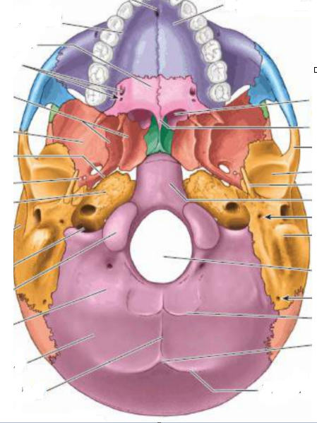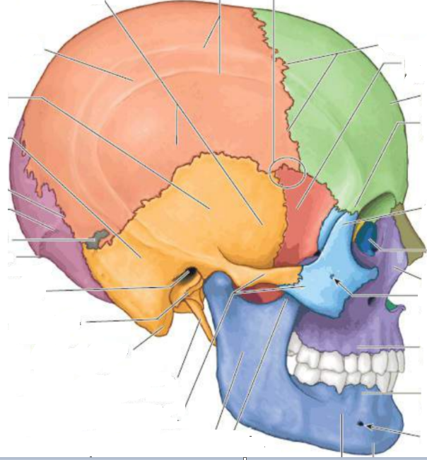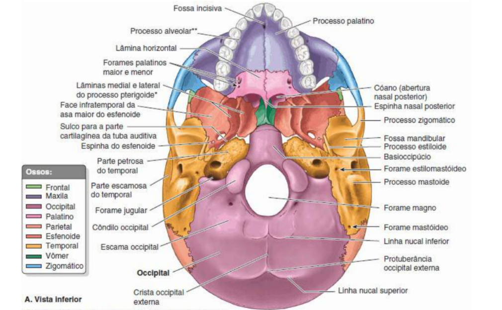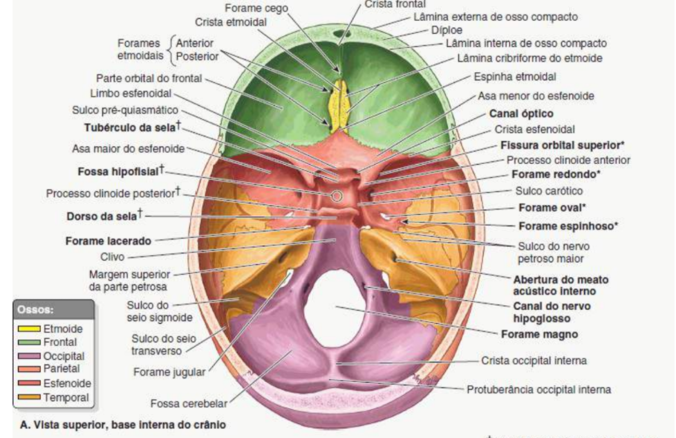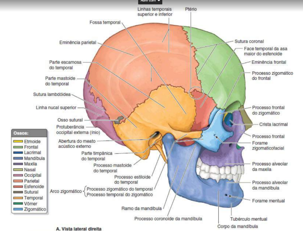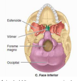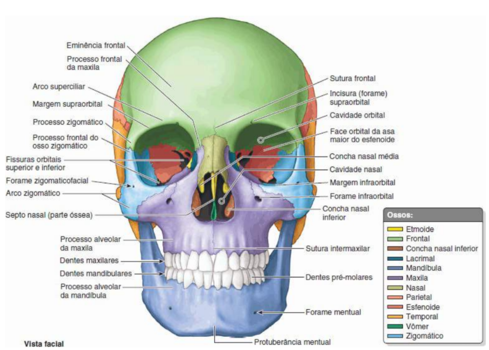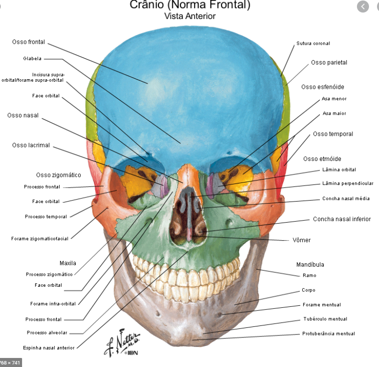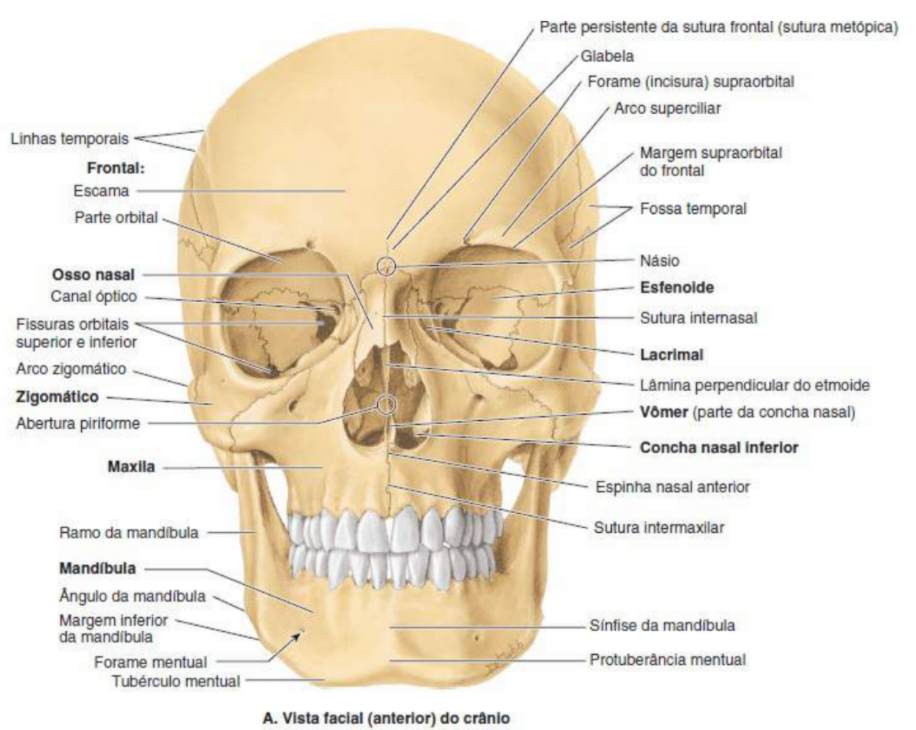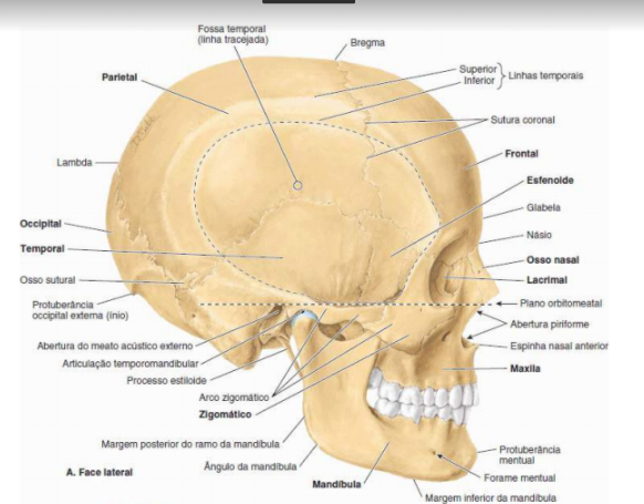 neurocranio: frontal, etmoide, esfenoide, occipital-impares, temporal e parietal-bilaterais- pares