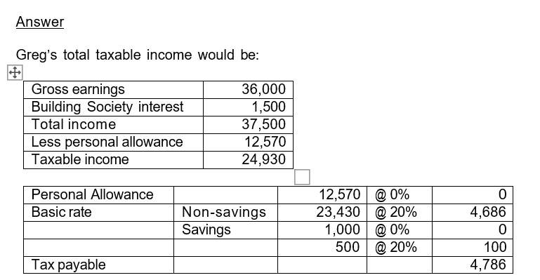 Greg is employed as a call centre manager and has gross earned income in the current tax year of £36,000. He also received interest from a Building Society account of £1,500. Calculate, showing all your workings, the total Income Tax he should pay.