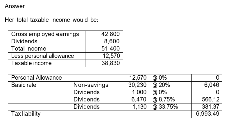 Jackson is also entitled to a £1,000 dividend allowance. The first £1,000 of his dividend income is therefore charged to tax at 0%. The remainder is charged at the basic rate for dividend income of 8.75% and the higher rate for dividend income of 33.75%.