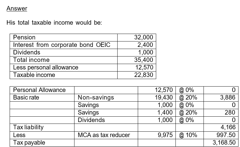 Andrew is aged 90, is married, and has gross income from pensions of £32,000 in the current tax year. He also received an interest distribution from his corporate bond OEIC of £2,400 and dividend payments of £1,000. Calculate, showing all your workings, the total Income Tax he should pay.