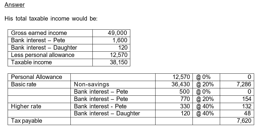 Pete has gross earned income of £49,000 from his employment as a graphic designer in the current tax year. From the bank account which he started for his 4-year-old. Calculate, showing all your workings, the total Income Tax he should pay. daughter, interest of £120 is received. He has other savings interest of £1,600.