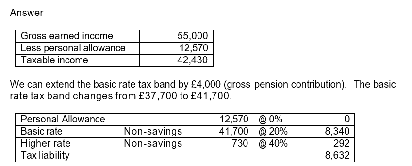 This is given by extending the basic rate tax band by the amount of the grossed-up contribution, so Lisa benefits from an additional £4,000 being taxed at 20% instead of at 40%. £37,700 + £4,000 = £41,700 x 20% = £8,340
