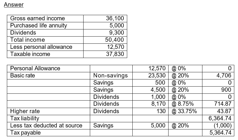 As a higher-rate taxpayer Jackson is entitled to a £500 personal savings allowance. The remaining savings income is charged to tax at 20% and he is entitled to a refund of the tax taken at source from the purchased life annuity.