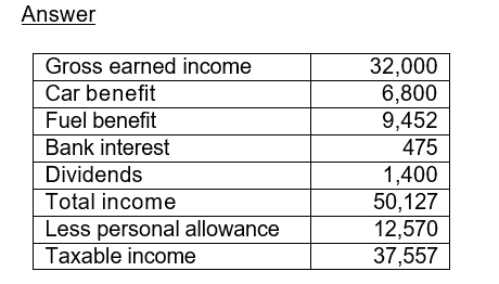 Allan has gross earned income of £32,000 in the current tax year. He also has a petrol company car with a list price of £20,000 and CO2 emissions of 145g/km, and fuel for private use paid for by his company. He received interest from his bank account of £475 and dividend payments of £1,400. Calculate, showing all your workings, his taxable income.