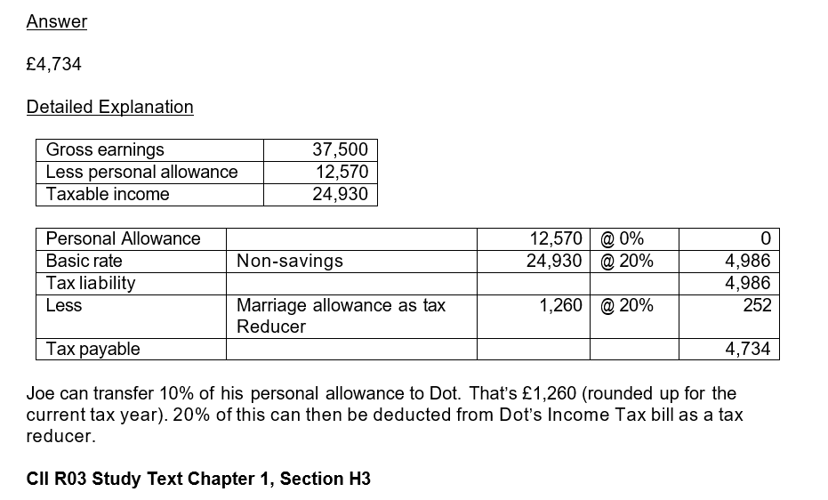 Dot earns £37,500 a year. Her husband Joe earns £10,000. If Joe makes an election under the marriage allowance, what will Dot’s Income Tax liability be for the current tax year?