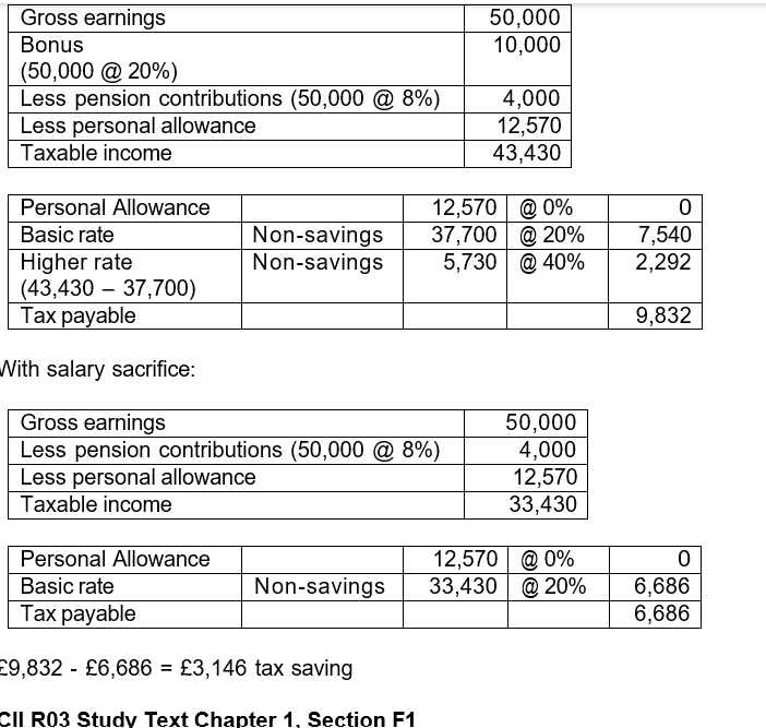 Steve, who earns £50,000 a year, is a member of a defined contribution pension scheme which operates under the net pay arrangement. Steve contributes 8% of his gross salary and his employer matches his contribution. Steve also receives a bonus of 20% of his salary each year. He has recently received a letter from his company regarding the introduction of salary sacrifice in lieu of the bonus. Calculate Steve’s Income Tax saving if he opts for salary sacrifice in lieu of his usual bonus.