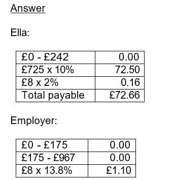 Earnings above £175 are normally liable for NICs at 13.8%. However, because Ella is under 21, her employer benefits from a 0% band between £175 and the upper secondary threshold (UST) of £967. Thereafter, employer NICs revert to 13.8%.