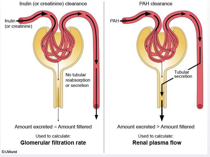 RPF = RBF x (1 - Hematocrit) or RPF = (urine [PAH] x V) / plasma [PAH]