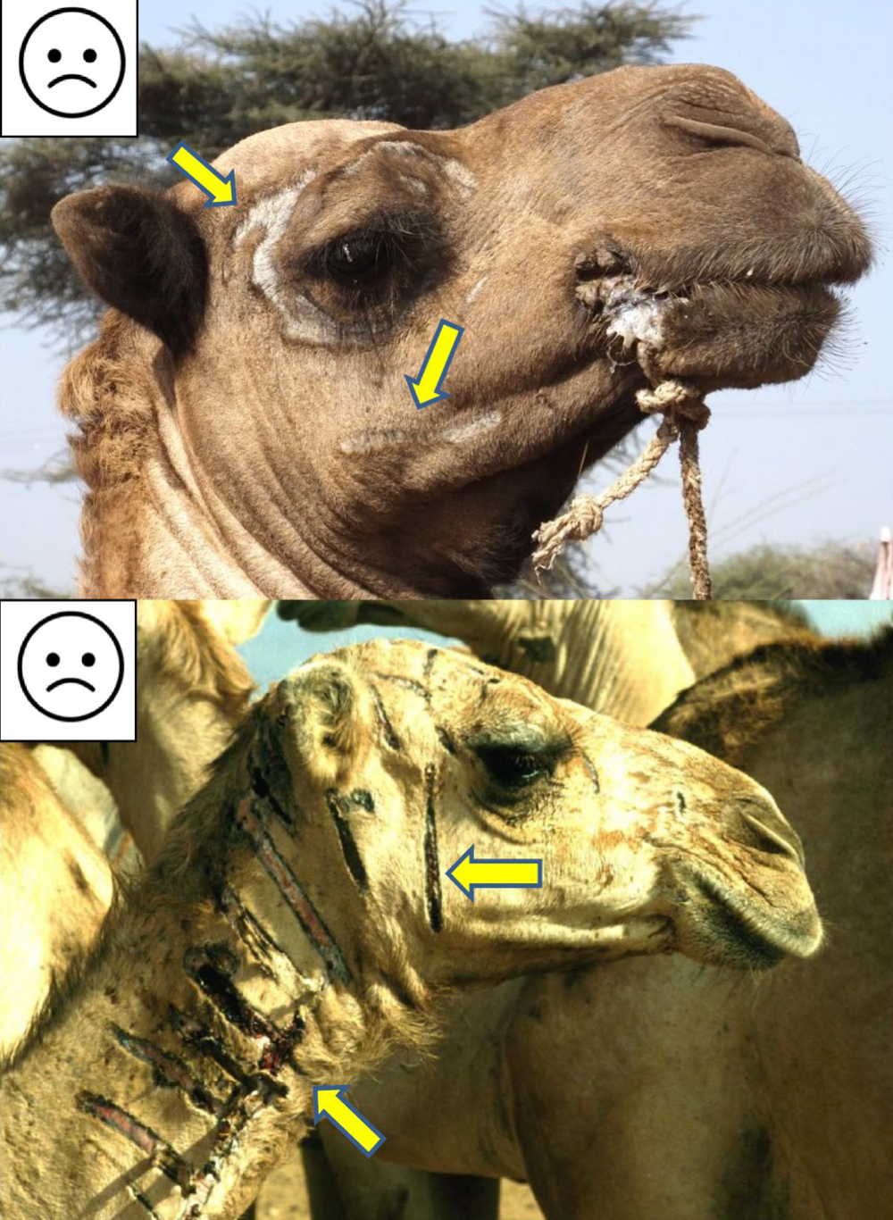 In what 3 ways does branding harm camels? Why is this typically performed?