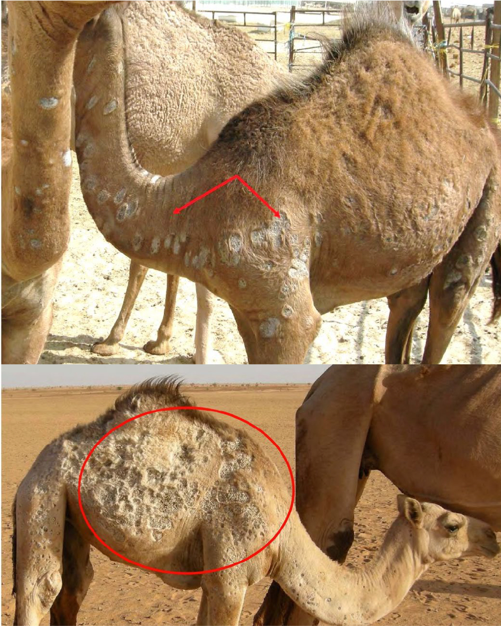 How are young and adult camels examined?