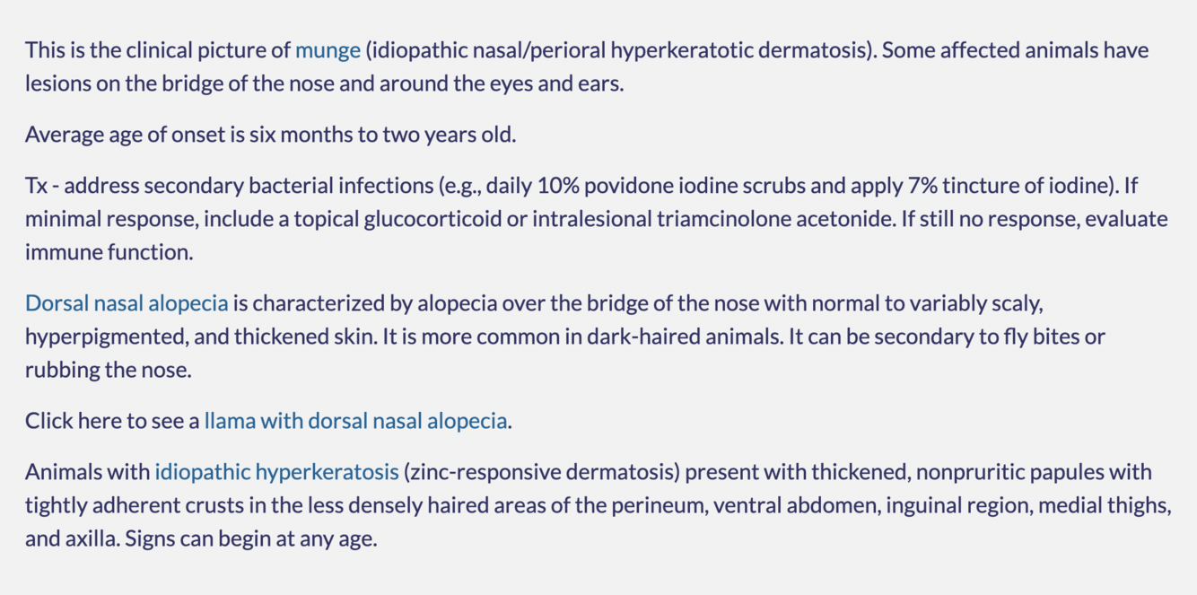 A one-year-old female llama is presented with hyperkeratosis around the nose and mouth.