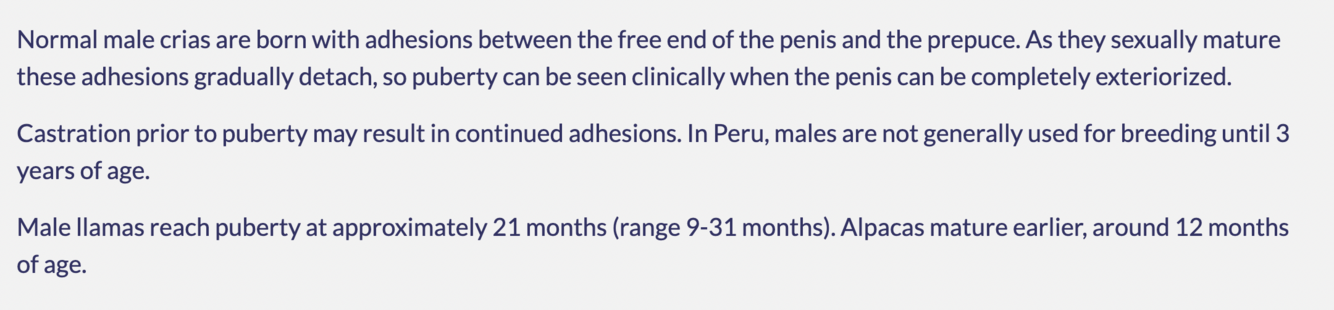 During examination of a newborn male cria (alpaga), adhesions between the free end of the penis and the prepuce are evident.