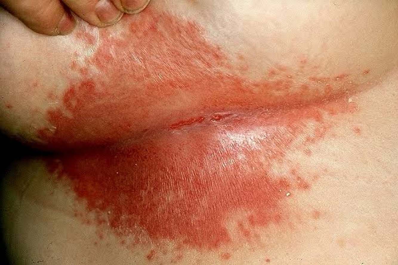 Infección en pliegues cutáneos por humedad, obesidad o vivir en zonas húmedas, con lesiones satélite.