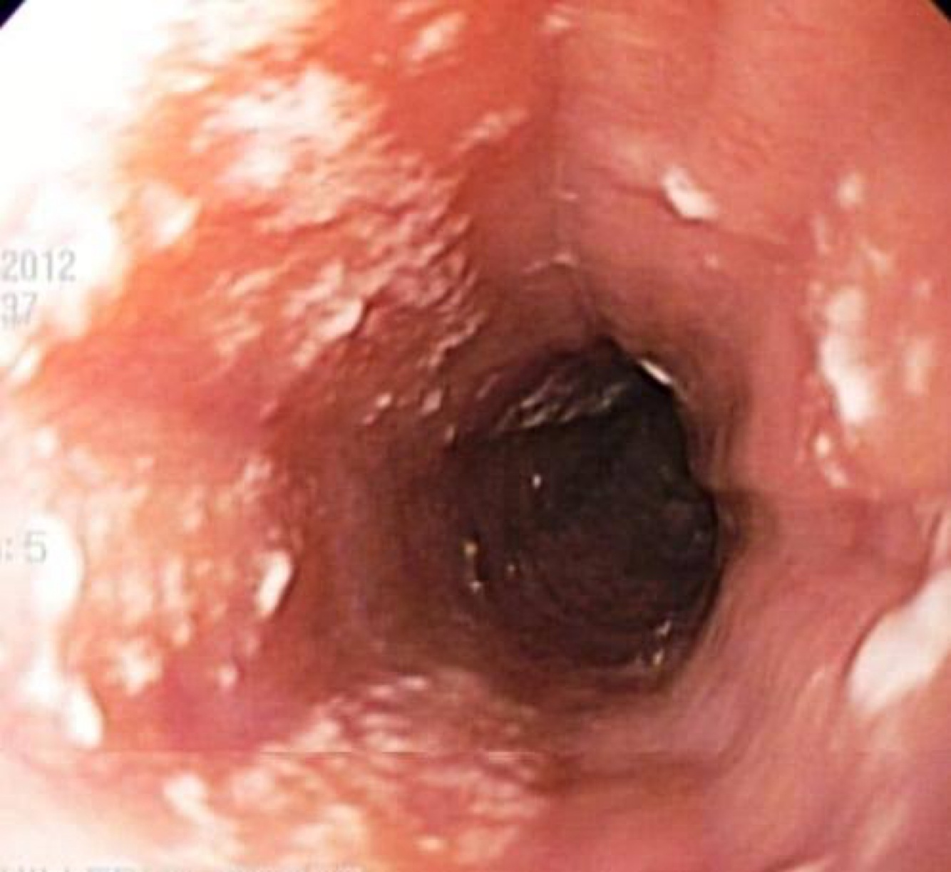 Placas blanquecinas en la mucosa que no sangran, más común en lactantes, ancianos con dentaduras, o jóvenes con enfermedades subyacentes.