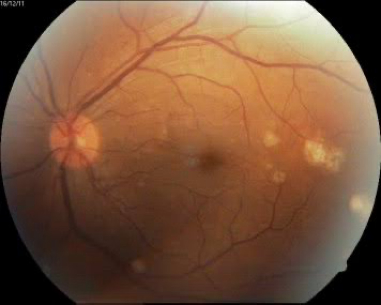 Exudados blancos en el fondo de ojo, frecuentemente asociados a intervenciones quirúrgicas.