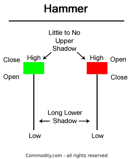 The Hammer formation is created when the open, high, and close are roughly the same price. Also, there is a long lower shadow, twice the length as the real body. When the high and the close are the same, a bullish Hammer candlestick is formed and it is considered a stronger formation because the bulls were able to reject the bears completely plus the bulls were able to push price even more past the opening price. In contrast, when the open and high are the same, this Hammer formation is considered less bullish, but nevertheless bullish. The bulls were able to counteract the bears, but were not able to bring the price back to the price at the open. The long lower shadow of the Hammer implies that the market tested to find where support and demand was located. When the market found the area of support, the lows of the day, bulls began to push prices higher, near the opening price. Thus, the bearish advance downward was rejected by the bulls.