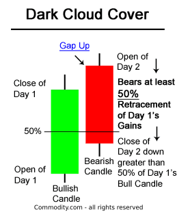 Dark Cloud Cover is a bearish candlestick reversal pattern, similar to the Bearish Engulfing Pattern (see: Bearish Engulfing Pattern). There are two components of a Dark Cloud Cover formation: