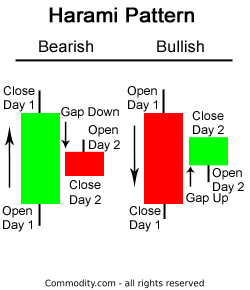 Bullish Harami: A bullish Harami occurs when there is a large bearish red candle on Day 1 followed by a smaller bearish or bullish candle on Day 2. Again, the most important aspect of the bullish Harami is that prices gapped up on Day 2 and price was held up and unable to move lower back to the bearish close of Day 1.