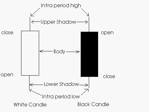 The candle is comprised of two parts, the body and the shadows. The body encompasses the open and closing price for the period. The candle body is black if the security closed below the open, and white if the close was higher than the open for the period. The candlestick shadow encompasses the intraperiod high and low. (Note: In candlestick charting the following periods are often used; 5 min, 15 min, 1 hour, daily and weekly). Long shadows, show that the trading extended well beyond the opening and/or closing price, while short shadows, show that trading was confined closely to the open and/or closing price.
