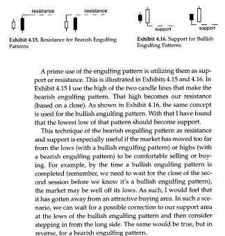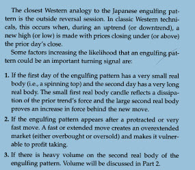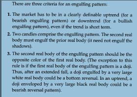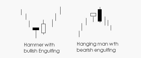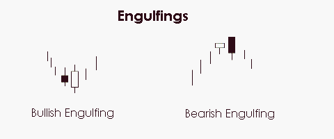An engulfing occurs when the candle body engulfs the previous candles body. White engulfing candles are bullish engulfings, where as black engulfing candles are bearish engulfings. Bullish engulfings are commonly found at short term bottoms, where as bearish engulfings at tops. Many candlesticks, such as dojis, hammers, hanging mans need confirmation of a trend change with an engulfing (bullish engulfing at bottoms, bearish engulfings at tops).