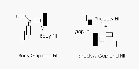 A gap occurs when a candlestick body doesn’t fall within the range of the previous candlestick body, a more loosely interpreted definition of a gap, requires no overlap between the shadows, making it obvious on a bar chart as well. You will often hear “All Gaps Get Filled”, which is untrue. While the vast majority of gaps do get filled, you can find some charts, where a gap has never filled. Depending on how you define a gap, should base your definition of a gap fill. For instance I consider a gap when 2 bodies don’t overlap, so I wait for a body fill to call the gap close. If one was using the criteria of shadow overlap, a gap fill would occur with a shadow fill. Gaps are typically continuation patterns, and sometimes mark the 50% point of a move. They become more significant as the stock approaches the level of the gap as it often acts as a magnet. During a gap fill, it is considered bearish closing below the bottom of the gap and bullish closing above it. Once formed gap’s will often serve as strong support/resistance levels even after being closed for some time.