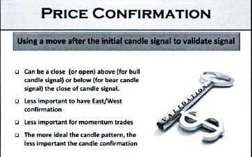 Hammers and hanging man’s are short body candle’s with little or no upper shadow, and a lower shadow at lease twice as long as the candle body. Hammers are formed after declines, and hanging man’s after advances. When confirmed they become powerful reversal signals, especially the hammer. The expression “hammers out a bottom” refers to when after the open, the downtrend in a stock continues, until at some point, enough buying interest is generated, to bring prices close to where they open. Confirmation comes from a bullish engulfing, showing the trader that the up trend is established. The color of the hanging man/hammer is unimportant, but some consider white hammers and black hanging man’s more potent reversal signals.