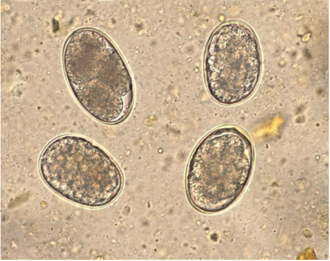 Hookworm; treat with Ivermectin, fenbendazole, pyrantel, or butamisole. Can penetrate through the skin of young pups and migrate to the lungs where they are coughed up and swallowed and mature in the small intestine. There, the worms suck blood and cause bleeding ulcers; up to 0.1 ml of blood per worm can be lost per day. Aberrant migration under the skin of infected people results in cutaneous larva migrans.